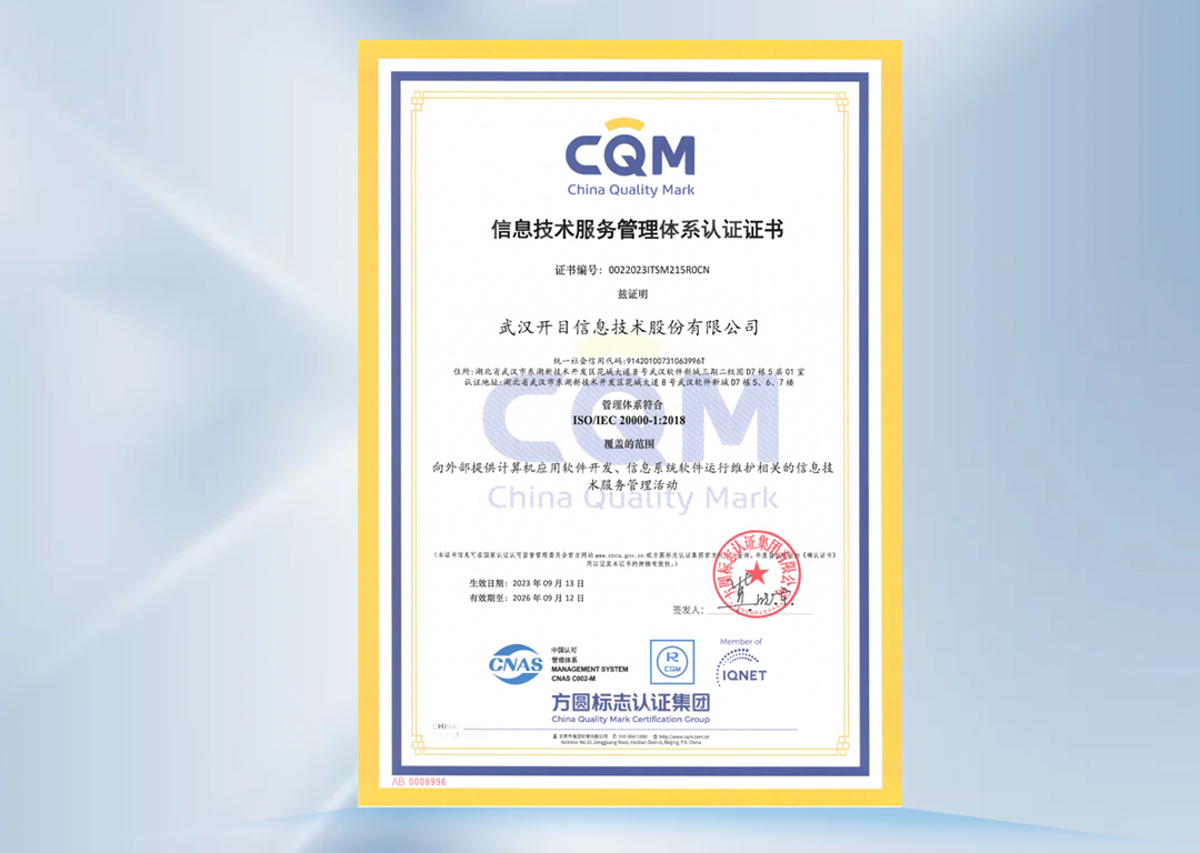 此次通過ISO20000體系認(rèn)證,標(biāo)志著開目軟件已構(gòu)建成包含組織架構(gòu)、服務(wù)管理流程、IT支撐系統(tǒng)和IT服務(wù)管理信息的一體化管控體系,具備輸出安全、可靠、高效的IT服務(wù)綜合實力,IT管理和服務(wù)水平邁上了一個新臺階。
