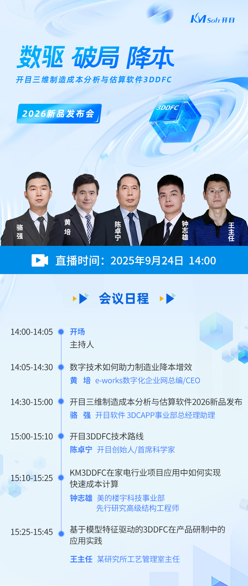 為深度解讀3DDFC 2026的技術(shù)突破與行業(yè)實踐,分享智能制造時代的產(chǎn)品成本優(yōu)化策略,開目軟件定于2025年9月24日(周三)14:00舉辦“數(shù)驅(qū) 破局 降本·開目三維制造成本分析與估算軟件3DDFC 2026新品發(fā)布會”,特邀您云端參會!