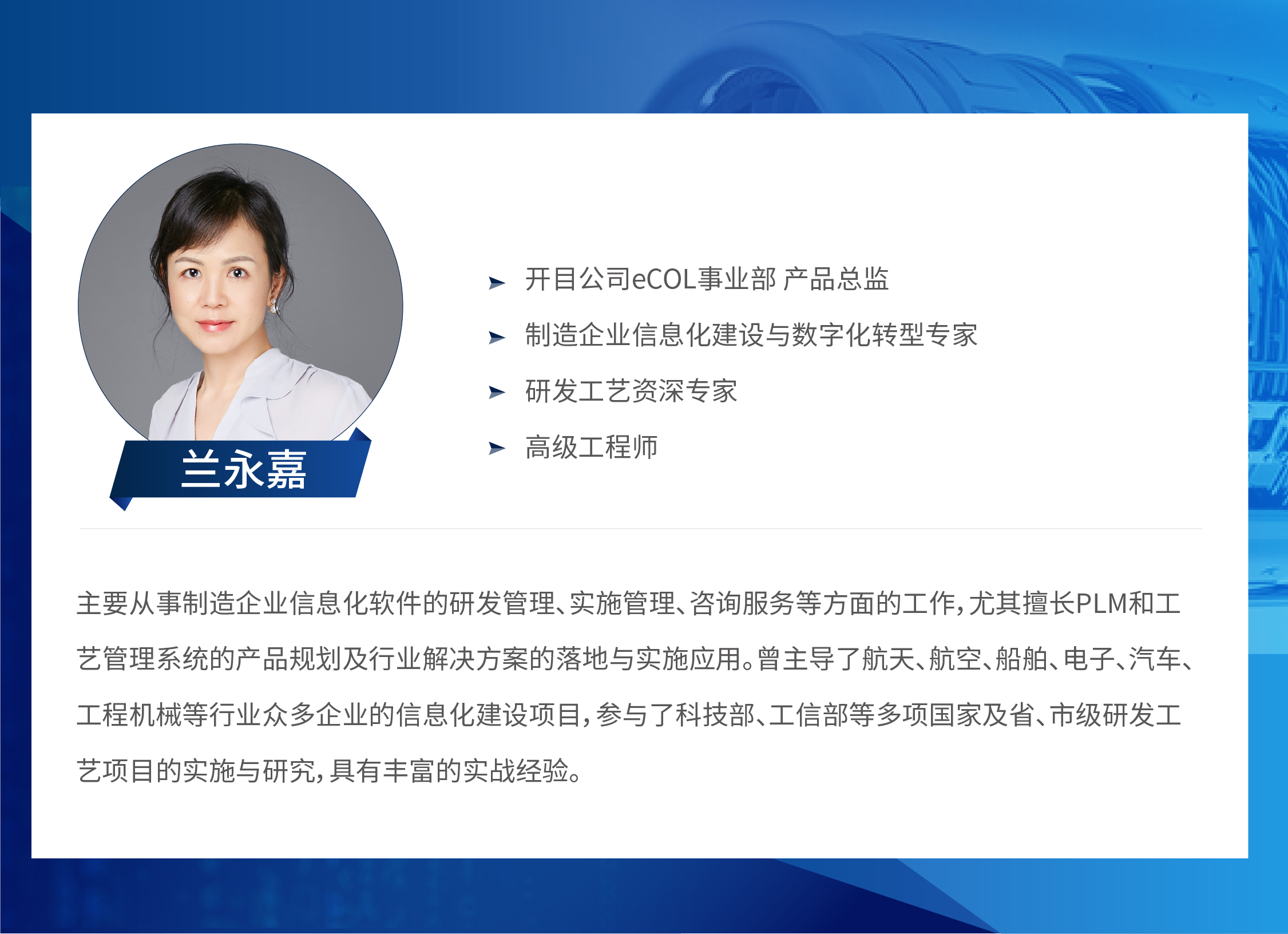 本期研討會特邀開目公司eCOL事業(yè)部產(chǎn)品總監(jiān)蘭永嘉女士、東風德納車橋有限公司制造信息化專家趙中軍先生、高德紅外工藝信息化專家施群先生做客開目線上直播間,專家將全程在線答疑,與來賓深入探討開目“研發(fā)工藝協(xié)同”的優(yōu)勢特點與實際落地應用。