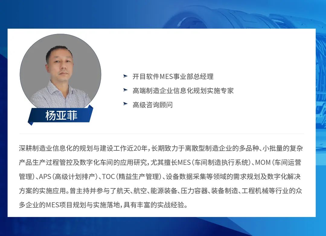 本期研討會特邀開目公司MES事業(yè)部總經(jīng)理?xiàng)顏喎?、四機(jī)賽瓦生產(chǎn)總監(jiān)黃志軍、廣日電梯信息中心副主任付東軍做客開目線上直播間,專家將全程在線答疑,與來賓深入探討開目制造執(zhí)行系統(tǒng)MES的優(yōu)勢特點(diǎn)與實(shí)際落地應(yīng)用。