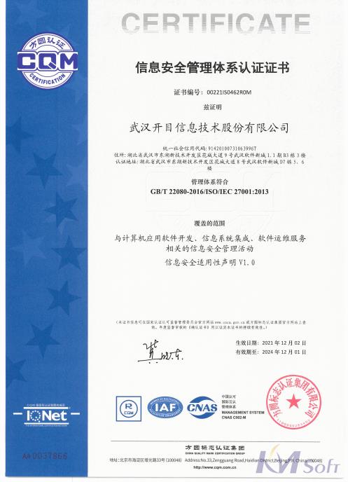 近日,開(kāi)目公司在各部門(mén)的積極配合與共同努力下,從自主研發(fā)的應(yīng)用軟件、信息系統(tǒng)集成、軟件運(yùn)維服務(wù)等核心業(yè)務(wù)版塊深度開(kāi)展了信息安全管理活動(dòng),并經(jīng)認(rèn)證中心專家組全面、嚴(yán)格、專業(yè)的審核,開(kāi)目公司順利通過(guò)了ISO27001信息安全管理體系認(rèn)證審核,獲得了認(rèn)證證書(shū)。