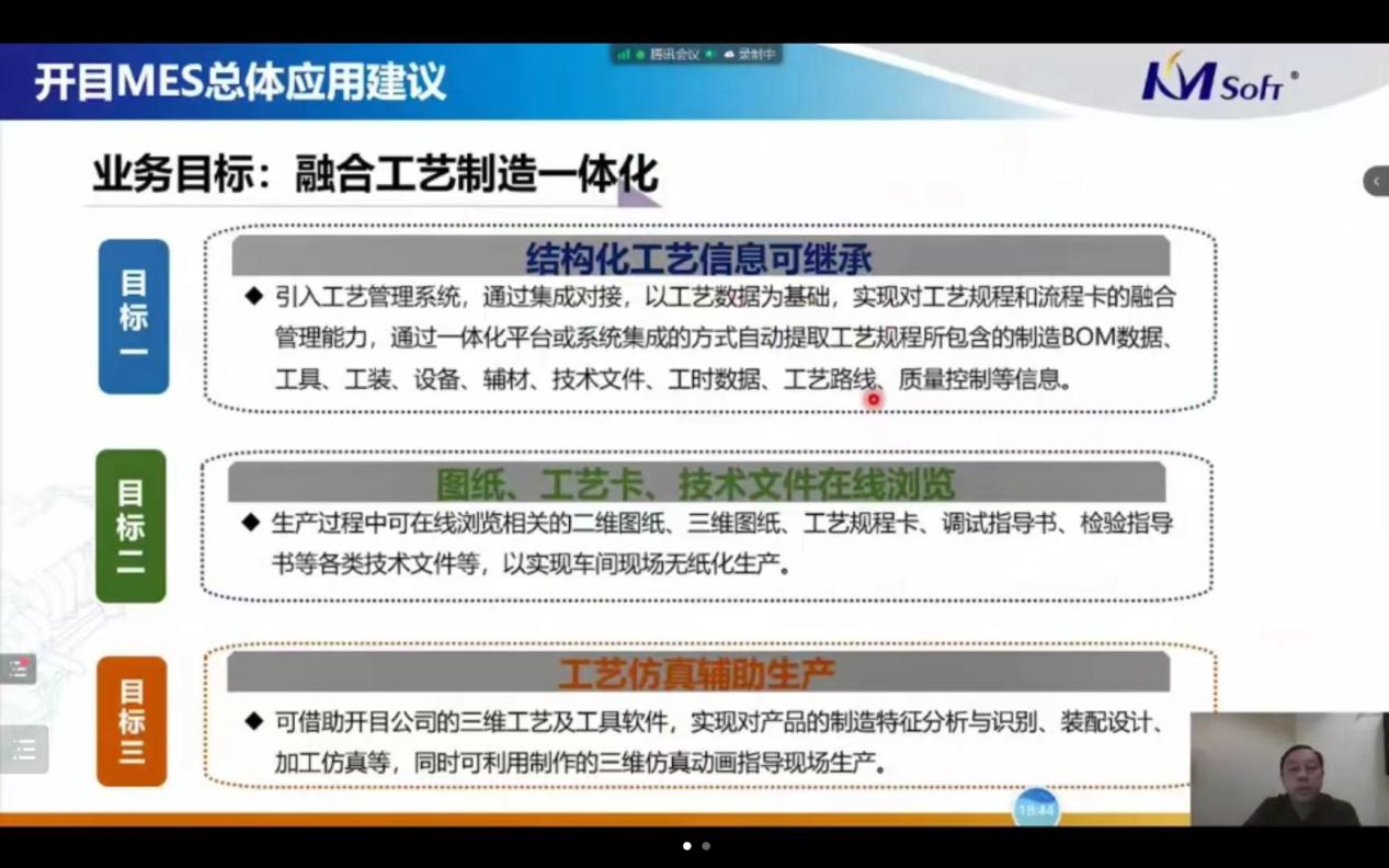 隨后,開目軟件MES事業(yè)部總經(jīng)理?xiàng)顏喎茋@《高端制造業(yè)的數(shù)字化工藝制造端到端應(yīng)用實(shí)踐》主題,也為參會(huì)企業(yè)詳細(xì)介紹了開目工藝與制造一體化解決方案的主要特點(diǎn)和應(yīng)用實(shí)踐,與來賓探討離散型制造企業(yè)如何打造智能車間,有效融合工藝制造,實(shí)現(xiàn)精益生產(chǎn)。