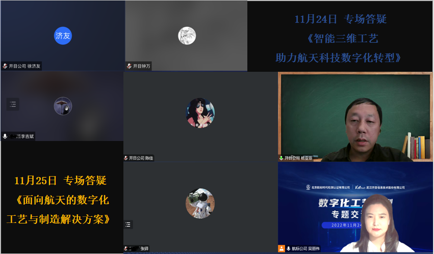 11月24-25日,開目軟件聯(lián)合北京航標(biāo)時(shí)代檢測認(rèn)證有限公司舉辦的航天科技“數(shù)字化工藝轉(zhuǎn)型”2場專題交流會(huì)圓滿落幕。開目公司3D事業(yè)部、MES事業(yè)部、咨詢顧問部的專家領(lǐng)導(dǎo)與開目航天科技的典型用戶:五院、九院的數(shù)字化工藝專家,共同就數(shù)字航天的工藝與制造技術(shù)展開深入交流和研討,航天科技集團(tuán)旗下50+所屬單位,約150余名數(shù)字化、信息化領(lǐng)導(dǎo),工藝師等線上參會(huì),反響熱烈。