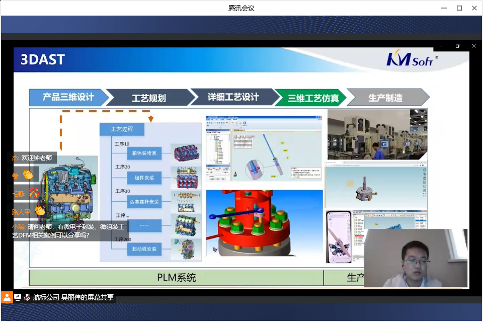 連線研討環(huán)節(jié),參會(huì)代表積極參與,踴躍互動(dòng):工藝的規(guī)劃和審查規(guī)則是基于什么標(biāo)準(zhǔn)制定,是否支持用戶自定義呢?DFM能否審查二維圖紙,二維與三維的尺寸標(biāo)注如何進(jìn)行審查?開目3DAST模型輕量化能對(duì)模型優(yōu)化多少比例,輕量化轉(zhuǎn)換后會(huì)不會(huì)存在模型數(shù)據(jù)丟失或信息缺失?3DMPS中工藝路線如何生成?如何實(shí)現(xiàn)工藝快速變更呢?工藝流程圖如何形成?三維工藝下車間如何實(shí)現(xiàn)?工藝制造一體化如何實(shí)現(xiàn)?······