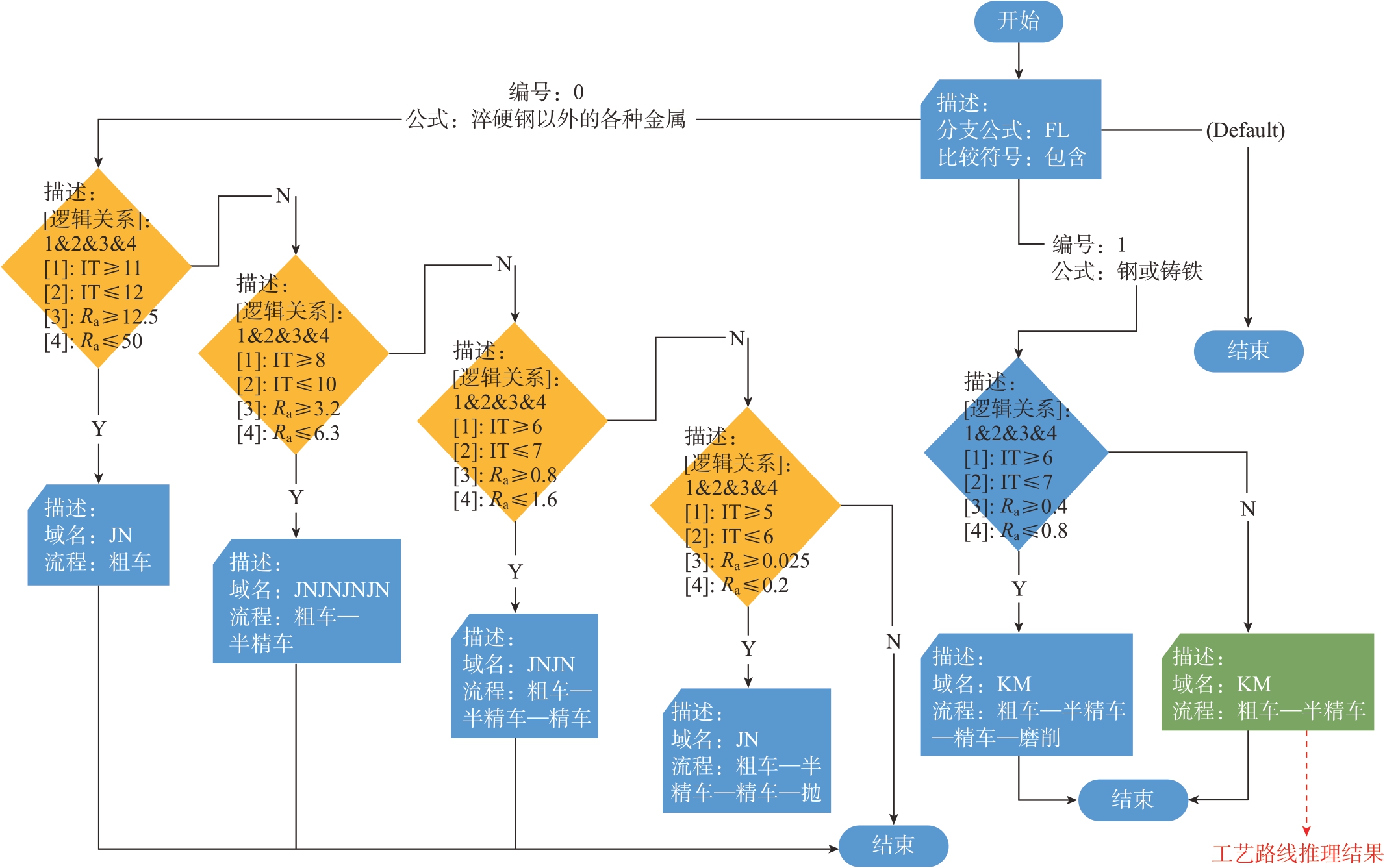 把工藝知識(shí)用可視化的流程圖的方式表達(dá)。流程定義包括流程圖的繪制、流程圖中圖元的屬性確定等工作。簡(jiǎn)化的加工方法推理流程判定邏輯如圖7所示。