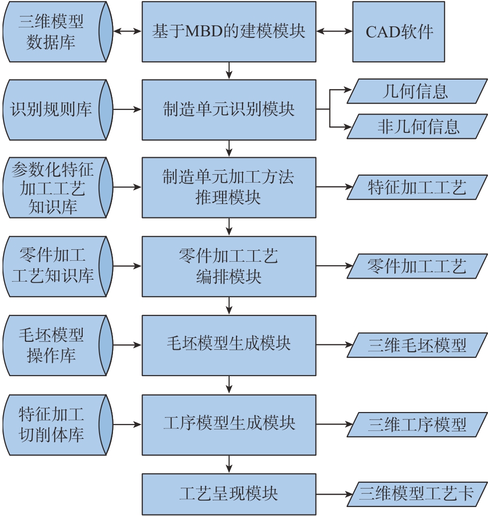 三維數(shù)字化工藝設(shè)計(jì)首先利用特征提取和識(shí)別技術(shù)分析零件MBD 模型,得到以特征為單位的幾何、工藝信息。然后,通過(guò)工藝推理和決策模塊獲得所提取特征,識(shí)別加工需要的設(shè)備和工藝參數(shù)信息。在此基礎(chǔ)上,通過(guò)人機(jī)交互編排工藝過(guò)程確定每道工序加工內(nèi)容,再構(gòu)建零件毛坯模型,然后基于每道工序加工內(nèi)容正向從毛坯到零件自動(dòng)創(chuàng)建每道工序的三維工序模型,最后推理每道工序的設(shè)備及刀具等加工參數(shù),從而形成零件的加工工藝過(guò)程。數(shù)字化工藝設(shè)計(jì)軟件技術(shù)路線如圖1所示。
