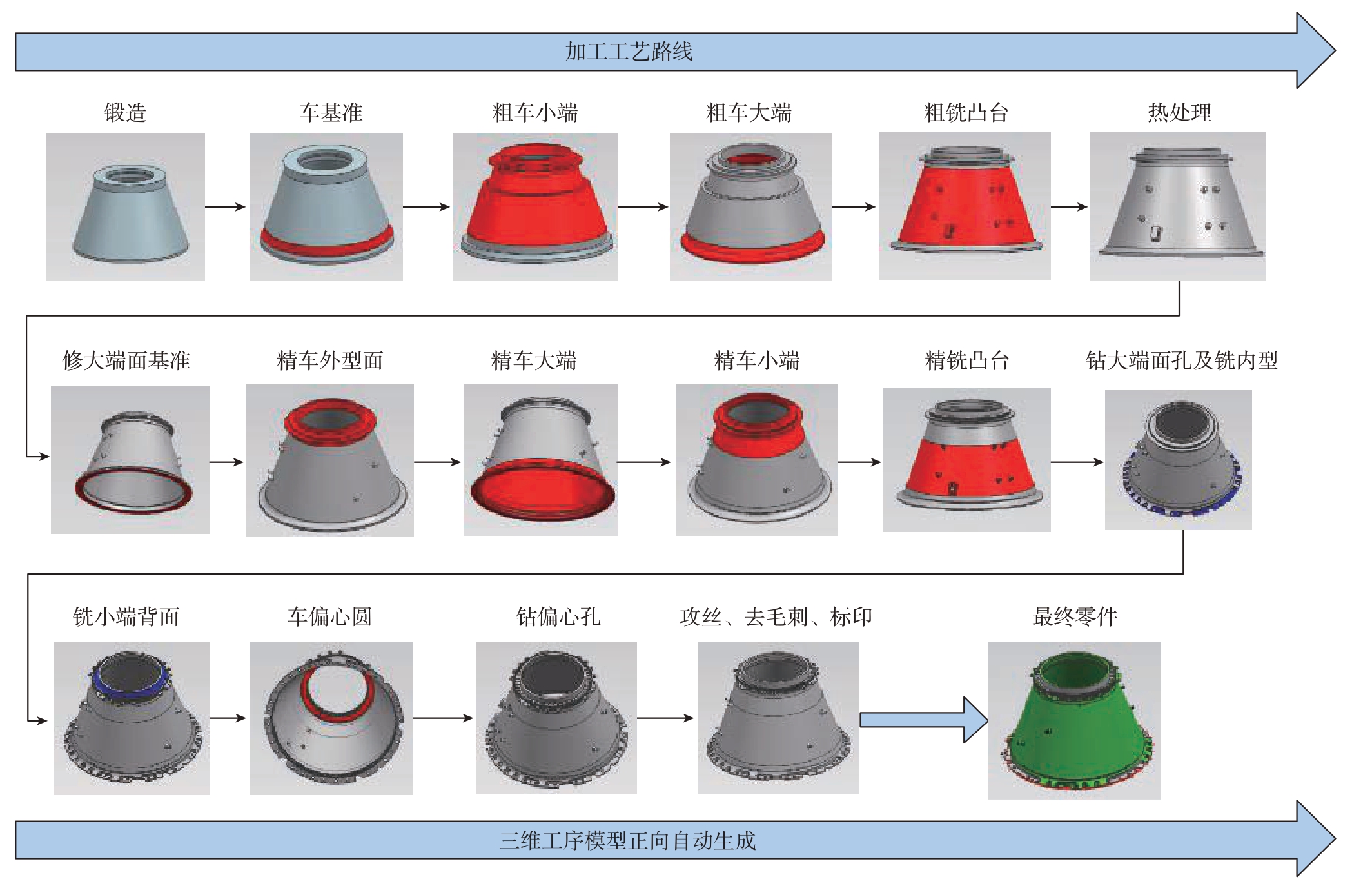 (2)通過(guò)工藝推理獲得特征的加工步驟與余量,然后根據(jù)典型機(jī)匣工藝模板確定機(jī)匣零件工藝路線,自動(dòng)構(gòu)建三維工藝模型,典型機(jī)匣零件加工過(guò)程如圖12 所示。