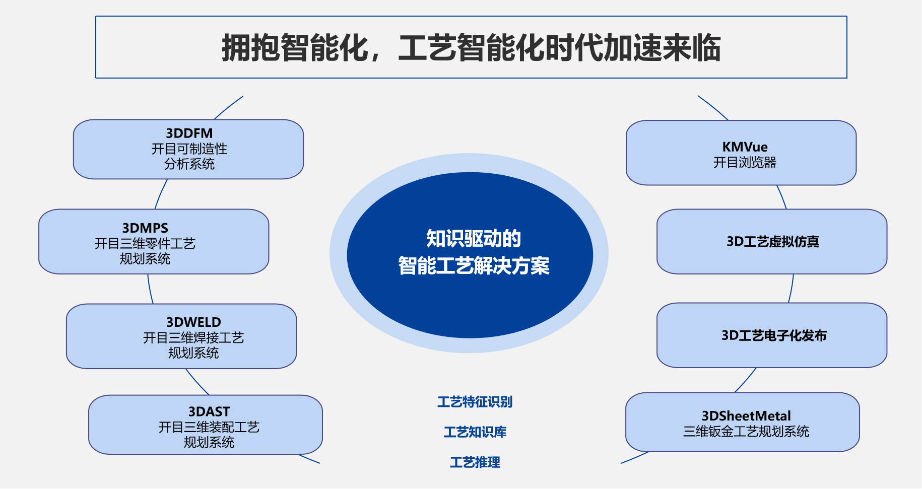 開目軟件自主研發(fā)的知識驅動的三維智能工藝設計與仿真解決方案,旨在利用 MBD 技術、智能推導、虛擬仿真等數(shù)字化技術,以知識與三維模型驅動,特征識別技術和專家知識庫為核心,搭建數(shù)字化設計與智能制造的橋梁,并與開目管理系統(tǒng)集成,實現(xiàn)企業(yè)三維技術的全面貫通,助力高端制造業(yè)客戶提質增效、降本減存,真替真代。
