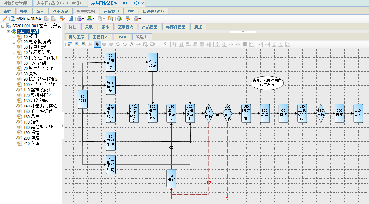 通過在工序流程圖中增加回轉(zhuǎn)線、標(biāo)注圖形、判定等圖形,能清晰和直觀的表達工序間的流轉(zhuǎn)。開目eCOL PLM 8.0新版本支持電裝、機裝、裝調(diào)等多專業(yè)的協(xié)同工作,支持自定義串行或并行的裝配過程,以及自動生成和輸出工序流程圖,用于生產(chǎn)車間的工作指導(dǎo)或展示等;支持在任意地方添加批注,醒目且直觀地體現(xiàn)工序流程圖的需注意事項;支持回退線用于滿足裝調(diào)等專業(yè)的調(diào)試需求,清晰地表達調(diào)試工藝過程中根據(jù)檢測結(jié)果來決定工序走向的情況。