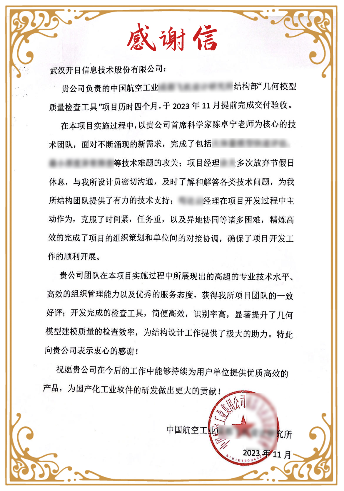 近日,中國航空工業(yè)集團(tuán)某研究所幾何模型質(zhì)量檢查工具(3DDFM)項目順利驗收,項目組僅用4個月便提前完成了大量艱難的個性化需求技術(shù)攻關(guān),實現(xiàn)了批量自動化的幾何模型質(zhì)量審查。為此,該研究所向開目軟件發(fā)來感謝信,對項目團(tuán)隊的敬業(yè)精神和專業(yè)技術(shù)實力,表達(dá)了衷心的感謝與夸贊。
