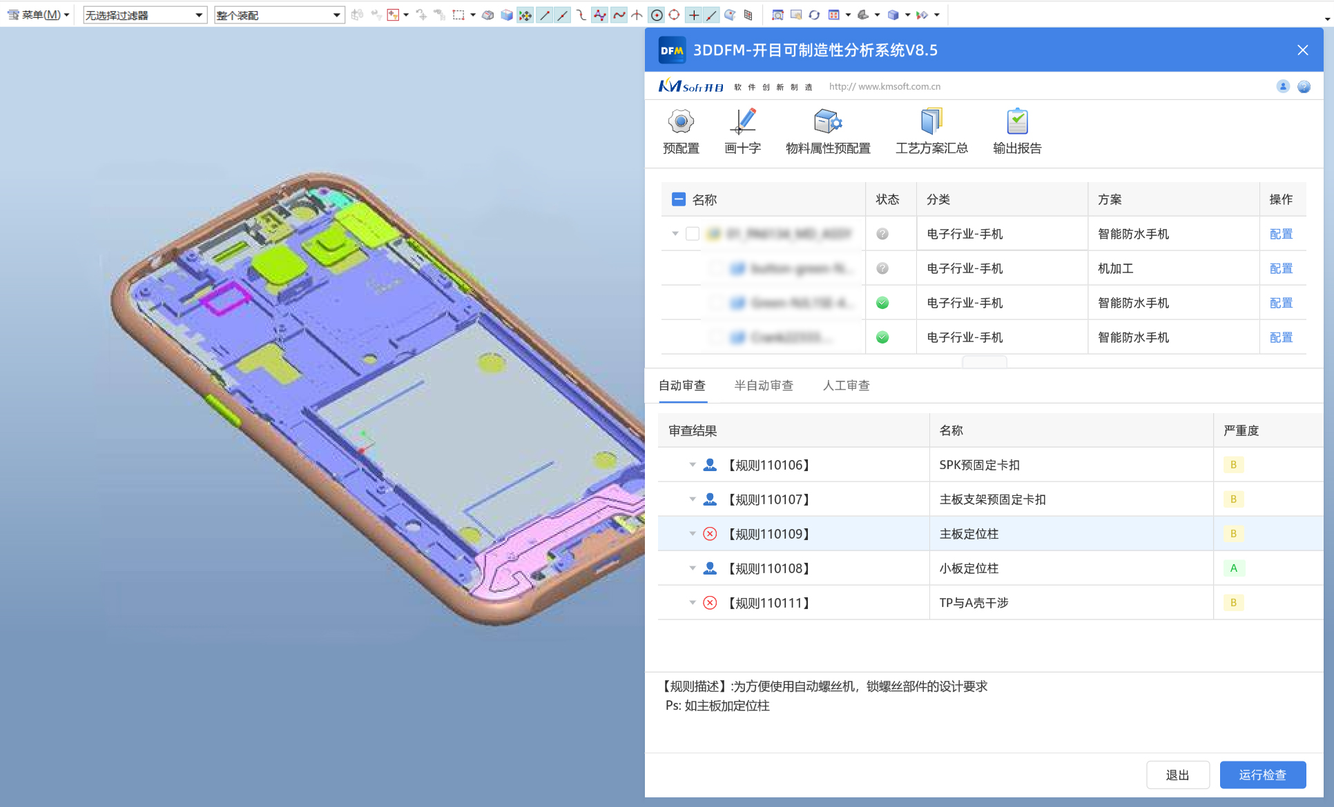 開目3DDFM兼容主流三維CAD,可根據(jù)規(guī)則對產(chǎn)品設(shè)計模型進(jìn)行檢查和分析,幫助設(shè)計人員、工藝人員、制造工程師盡早發(fā)現(xiàn)設(shè)計中難以制造、無法制造或制造成本高的設(shè)計缺陷,減少工藝性評審時間以及設(shè)計與工藝往返次數(shù),縮短產(chǎn)品開發(fā)周期。