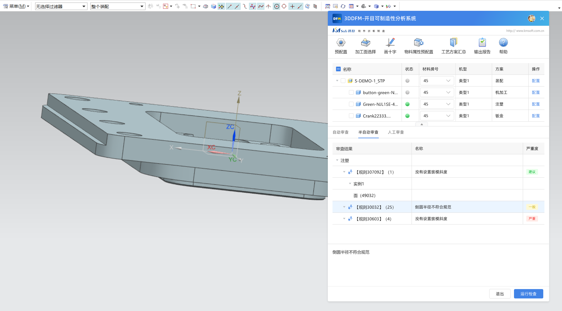 開目團(tuán)隊為企業(yè)開發(fā)適配了符合實際業(yè)務(wù)需求的審查規(guī)則庫,覆蓋機(jī)加、鈑金、注塑、壓鑄、裝配等制造工藝,統(tǒng)一了可制造性審查標(biāo)準(zhǔn);通過一鍵式操作、智能化分析,企業(yè)工程師可快速對三維模型的合規(guī)性、零件結(jié)構(gòu)的工藝性和裝配件的可裝配性進(jìn)行分析,從而在產(chǎn)品試制之前預(yù)先發(fā)現(xiàn)設(shè)計工藝性問題,減少工藝評審時間以及設(shè)計到工藝的往返次數(shù),提升審查效率,縮短產(chǎn)品研制周期。