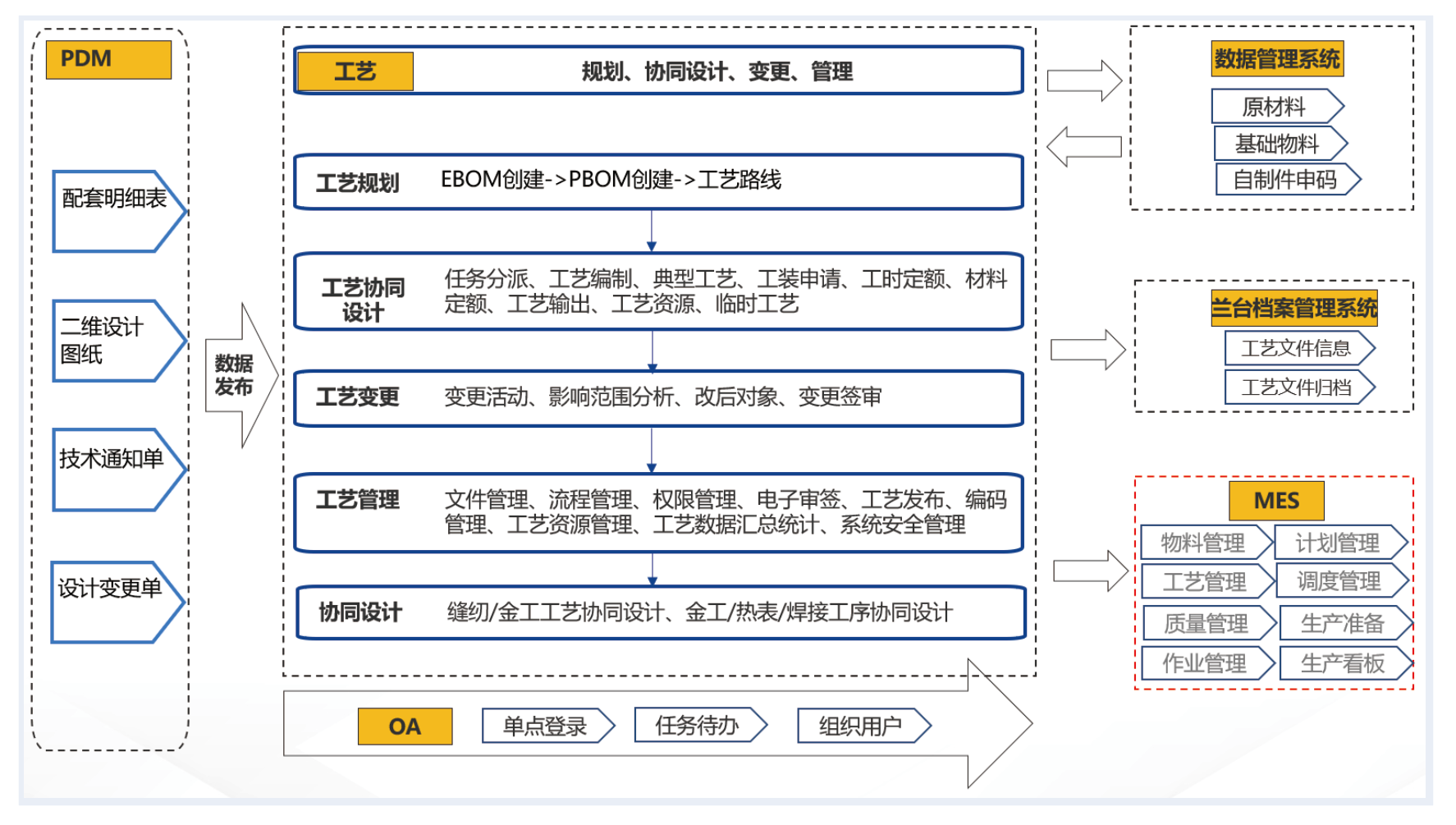 與PDM、OA、數(shù)據(jù)管理系統(tǒng)、檔案管理系統(tǒng)的深度集成,實(shí)現(xiàn)跨部門數(shù)據(jù)流實(shí)時同步,消除信息孤島,打通從設(shè)計、工藝到生產(chǎn)的數(shù)據(jù)流,構(gòu)建協(xié)同高效的信息化生態(tài)。